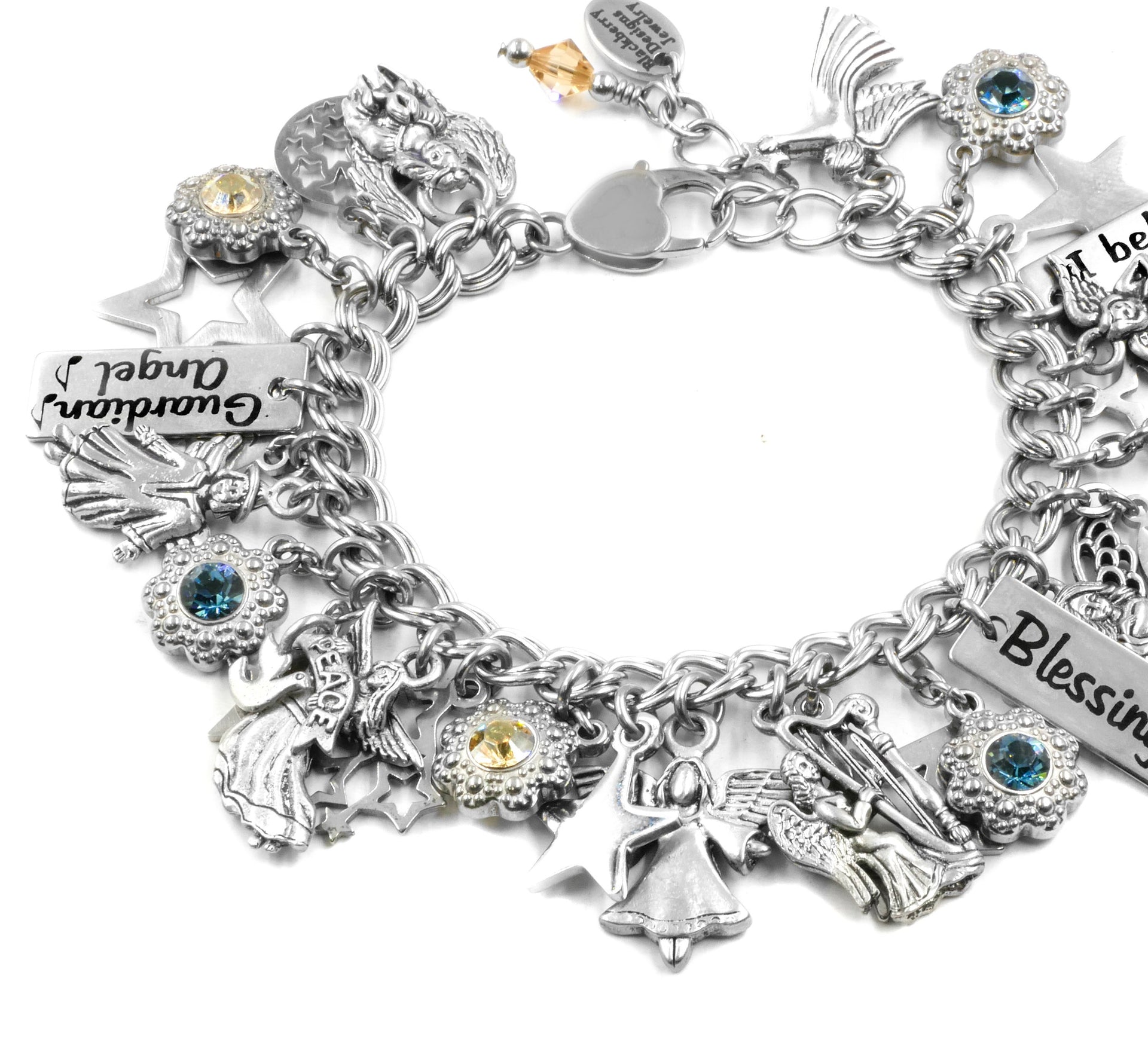Let your Angels watch over you with this joyful Guardian Angels charm bracelet reminds us that all of us have angels who watch over us. If you listen closely you may hear their magical music.  One of a Kind artist created jewelry because quality is remembered.