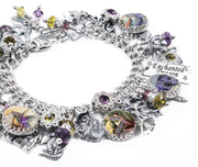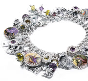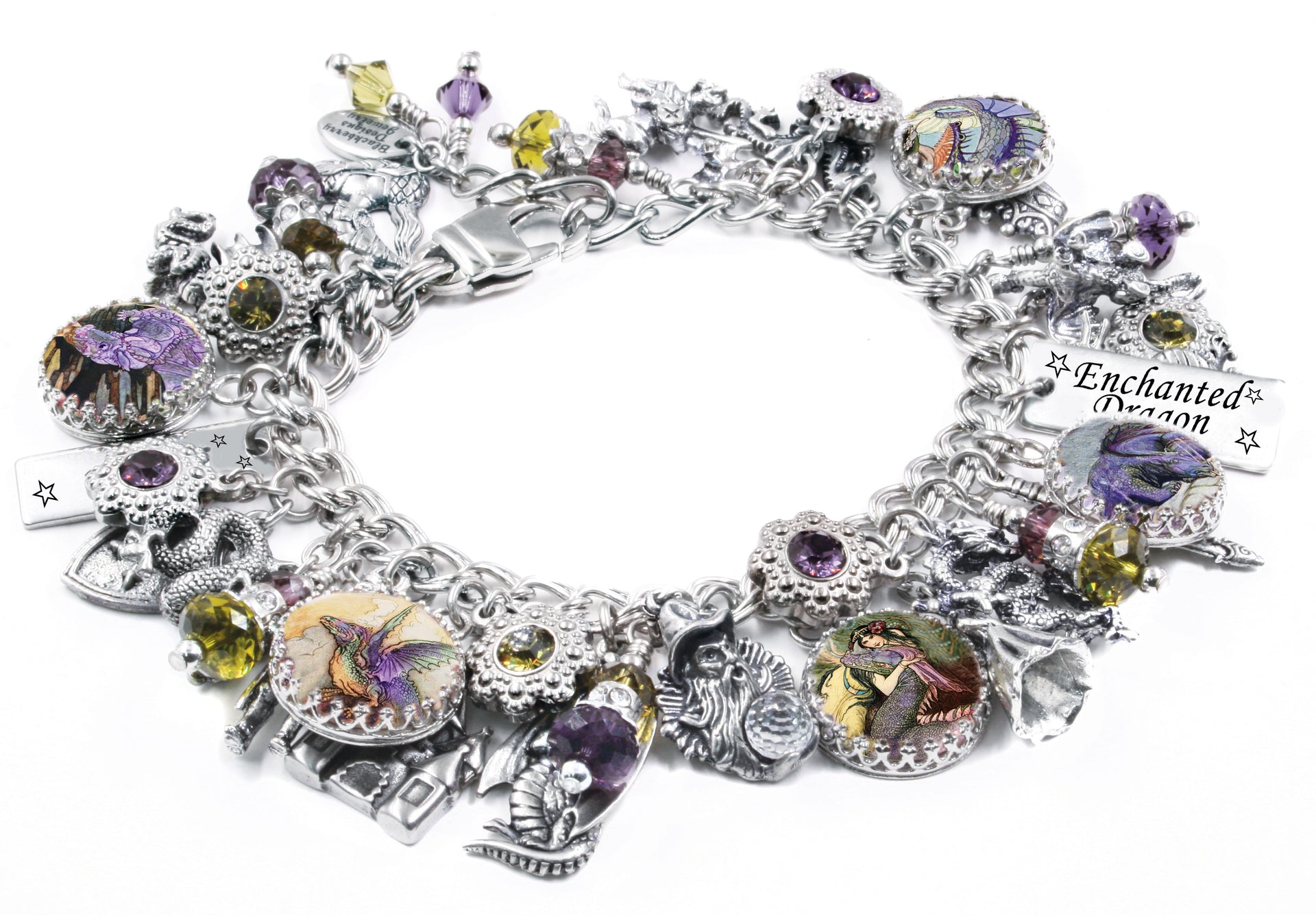 You believe in a magical world, because you believe in Dragons. Celebrate the enchantment of Dragons with our Magical Dragon Charm Bracelet. There are five beautiful dragon images surrounded by colorful amethyst and green Sparkling crystals, 3 engraved charms Enchanted Dragon, Magic, Wish, and 14 dragon themed charms in silver. Handcrafted Artisan Jewelry in Timeless Stainless Steel.