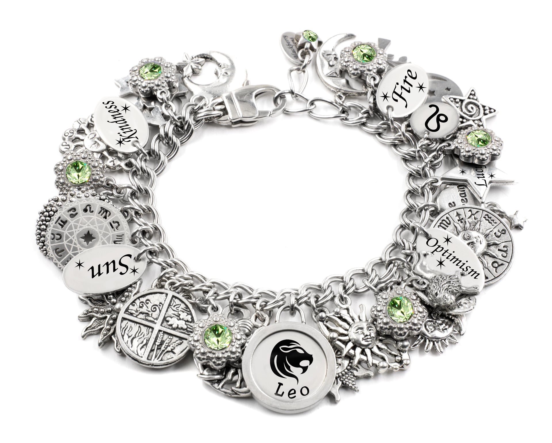 Express yourself Leo with unique astrological Leo jewelry! You're an Leo Horoscope Charm Bracelet Girl so are very optimistic about everything you do. Express your Leo traits with this amazing Leo Zodiac Charm Bracelet. Featuring 16 silver zodiac and horoscope themed charms. Twinkling stars, element sign or earth fire water air, horoscope charms, planet, 12 sun signs, and crescent moons. Top that off with a fun Leo the Lion charm and Engrave charms.