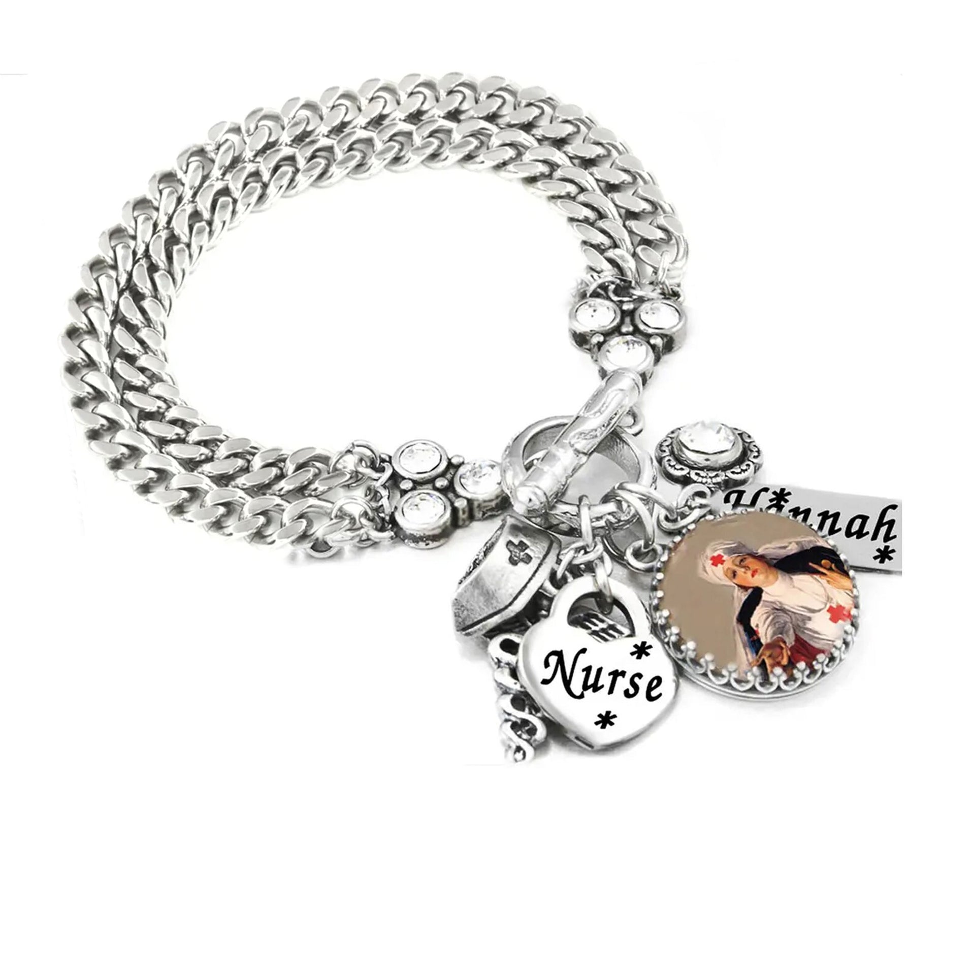 Celebrate her career as a nurse with our personalized nurse bracelet. Its a career and a calling honoring the heroes who care more. Iconic vintage image of a nurse from the 1940;s personalized engraved name, and choice of birthstone charm. Artist handcrafted one of a kind jewelry in Timeless Stainless Steel. How it's made matters.