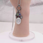 This family tree necklace includes the children’s or grandchildren’s names, birthstones, a personalized engraved charm, and two silver charms of your choice. Choose up to 7 names and birthstones to be engraved on the necklace in a silver pendant. You could even choose to add the kids’ and grandkids’ initials on this necklace instead of their names. Also select two special charms from our Charm Catalog to represent grandma or the family.