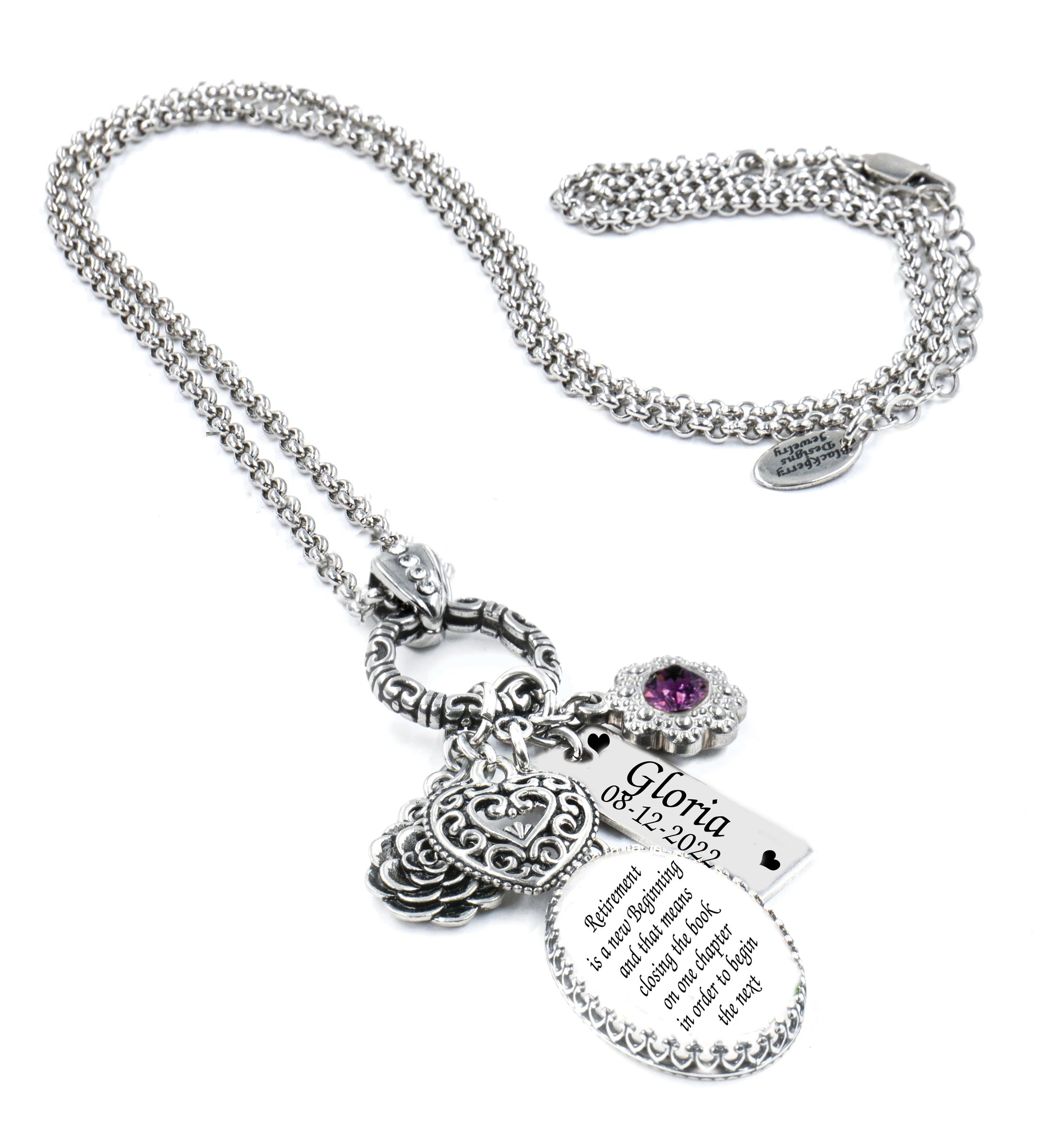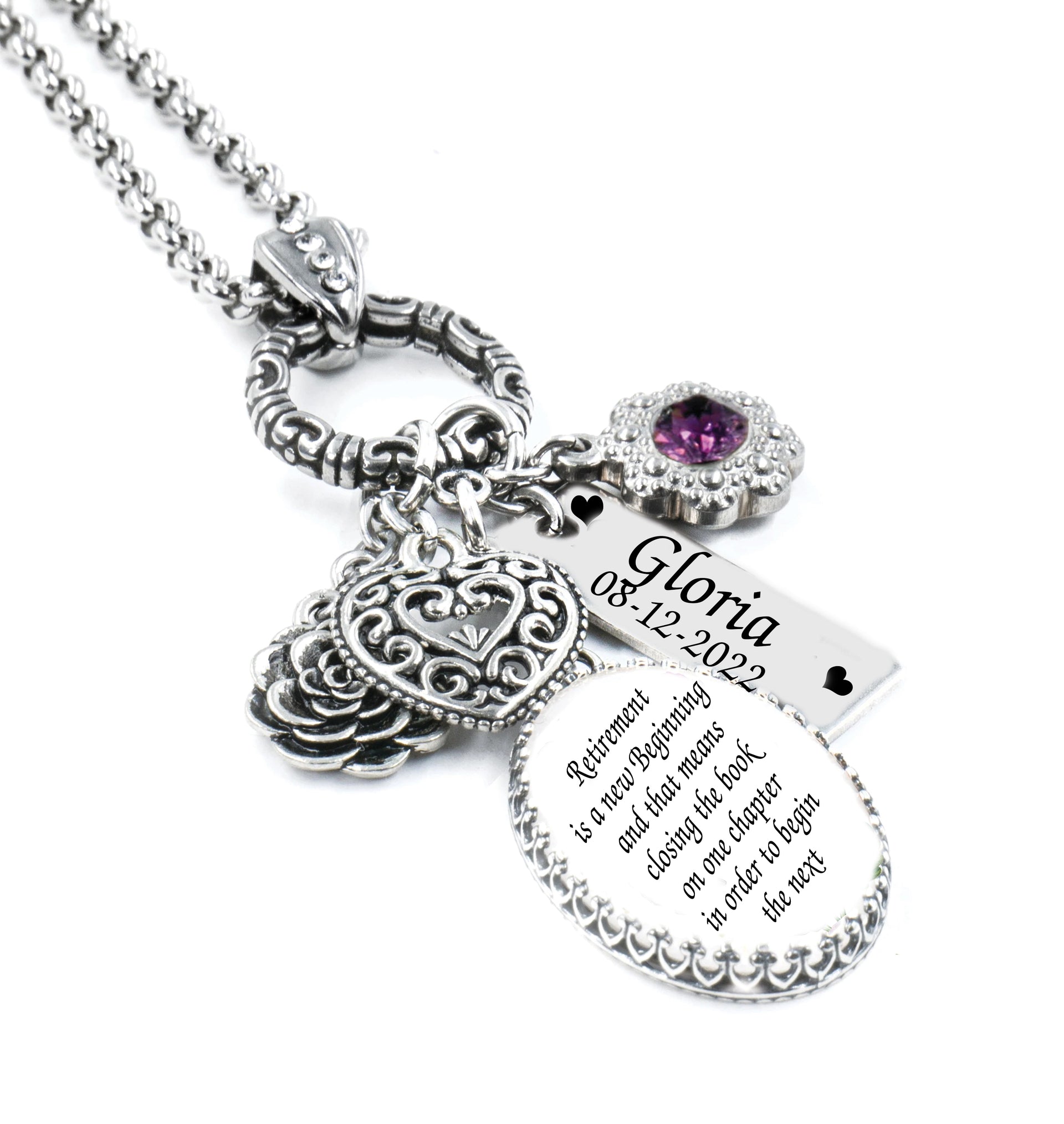 They're Retiring what a wonderful way to honor this next chapter in her life with a Personalized Retirement Necklace that she'll have for years. Choose charms, crystal color, and custom engraving for a wonderful one of a kind necklace as unique as her. Handcrafted and personalized in non tarnishing stainless steel.